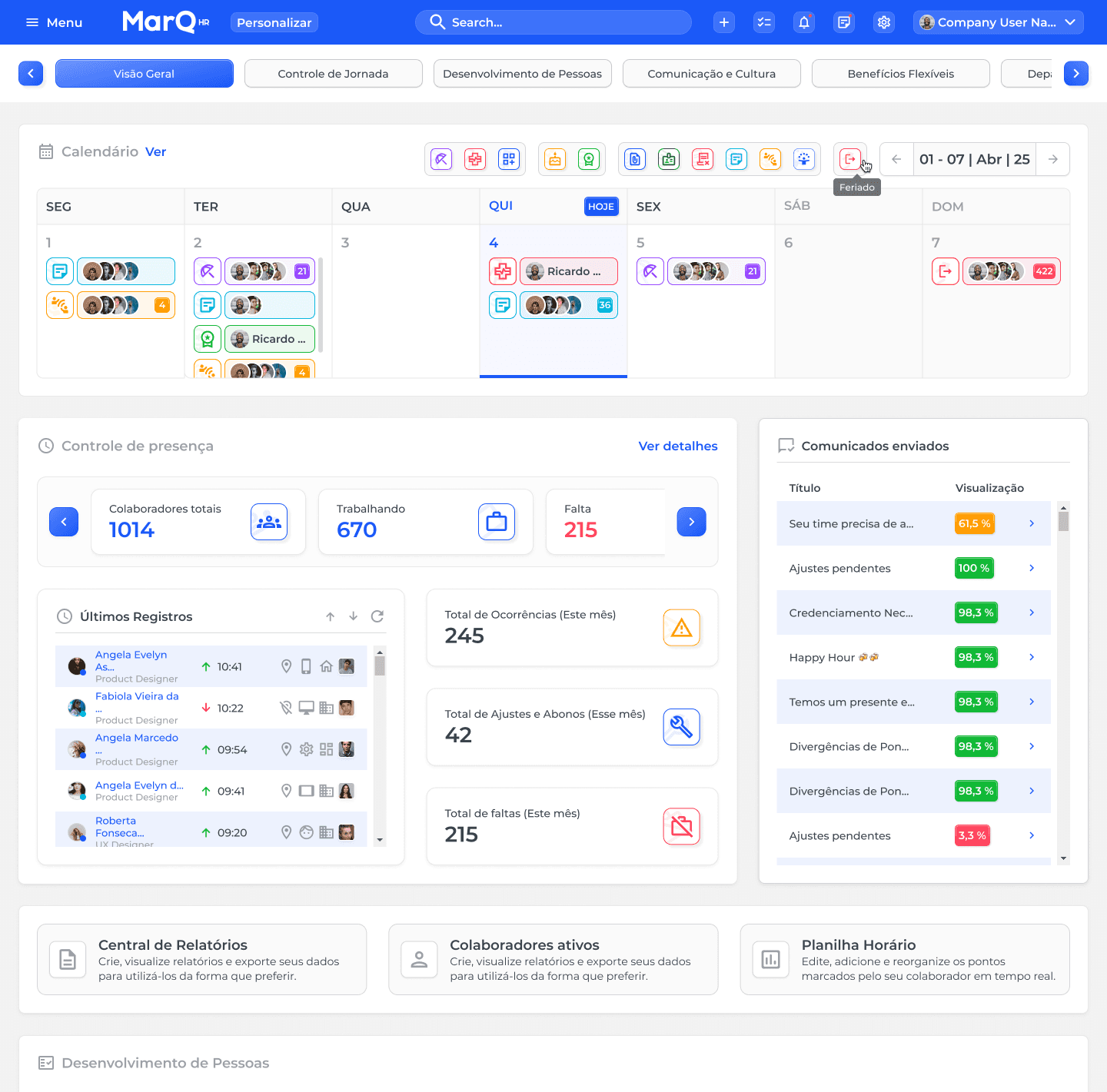 Os feedbacks são integrados a outras funcionalidades-chave da MarQ HR. Isso permite uma visão 360° do colaborador, conectando desempenho, objetivos e evolução em uma jornada única.